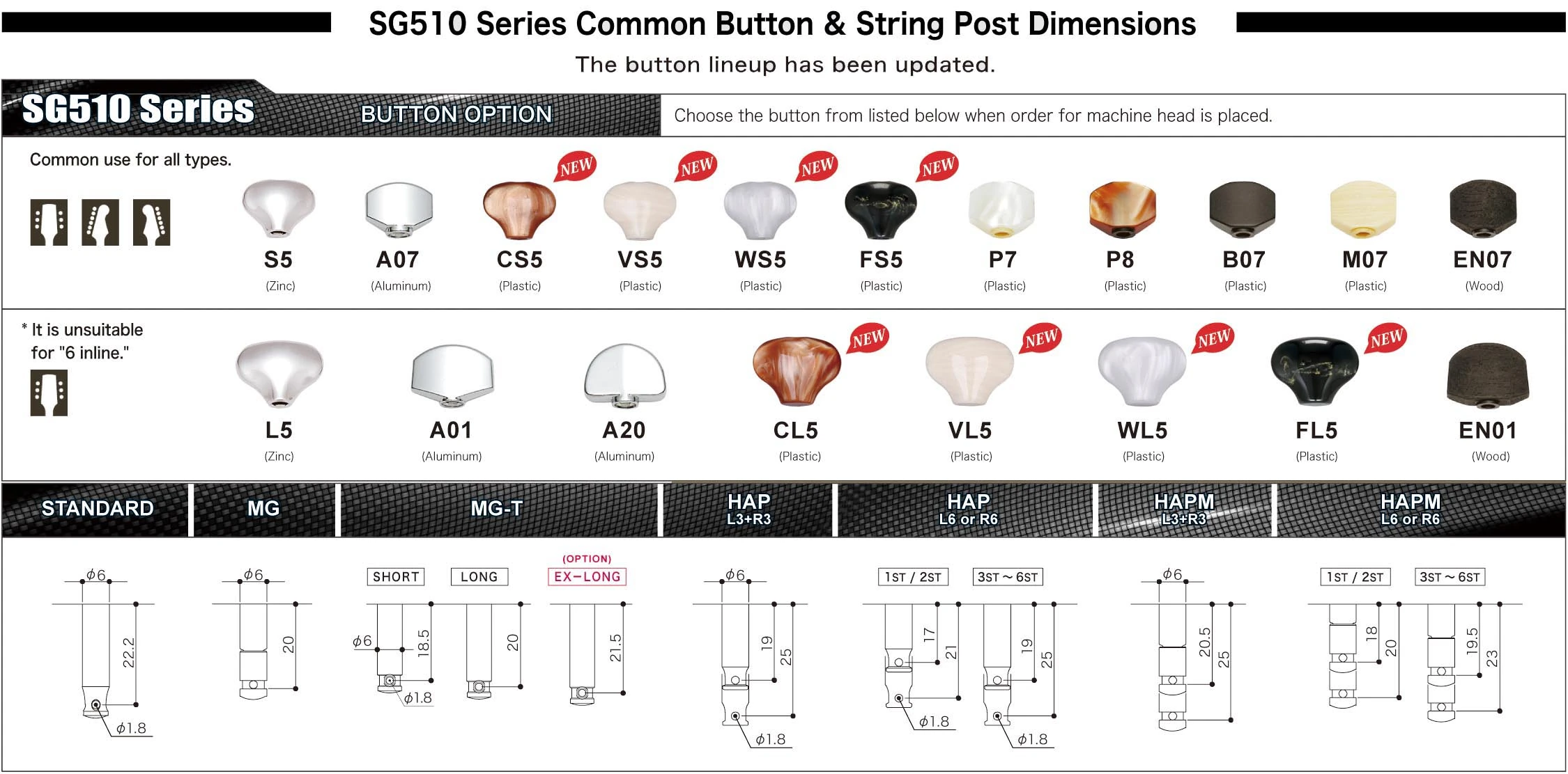 These machine heads are used on a handful of AE series acoustic guitar models. For an inventory of models using the SGS510Z, see this list.