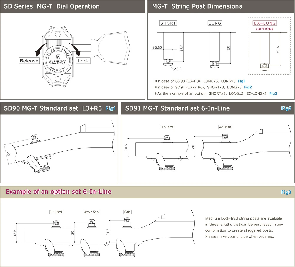 The Gotoh MG-T (Magnum Lock-Trad) mechanism allows the user to lock the tuners once the instrument is in tune. It features a thumbscrew locking mechanism to stabilize tuning while playing and preventing incidental contact with the tuners from altering the instrument's tuning.