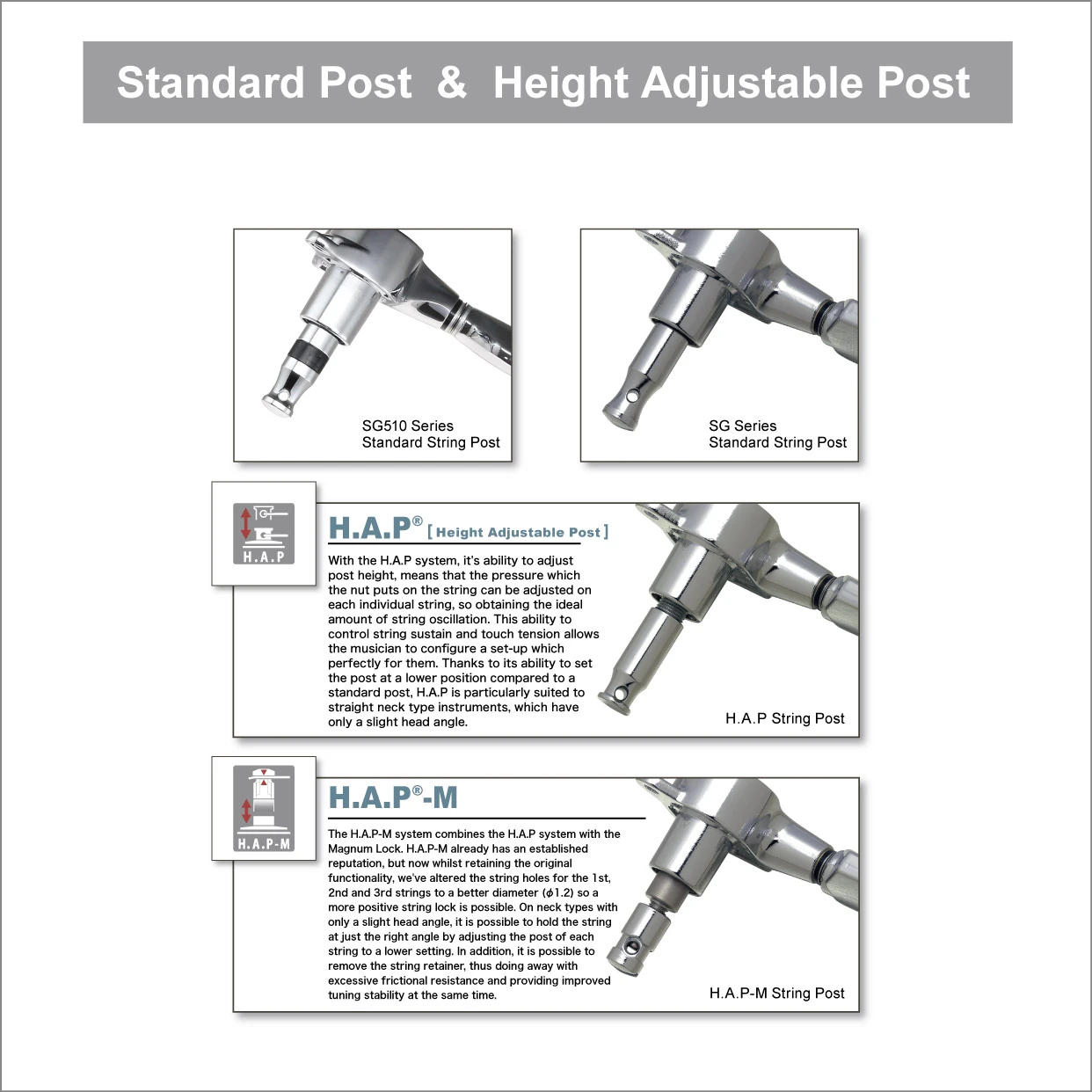 The SGS510Z is available with height-adjustable posts (H.A.P). This allows the user to adjust individual strings to dial in the oscillation, which contributes to sustain. The H.A.P-M design combines the adjustable post height with the Magnum Lock system.