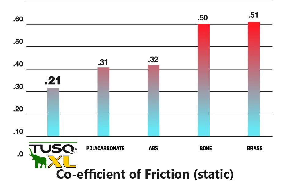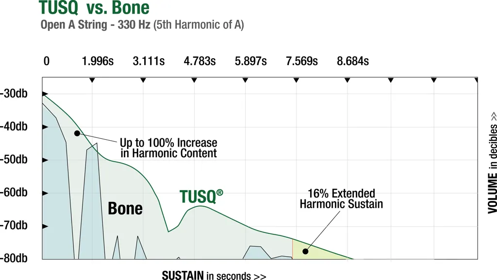 As its name implies, TUSQ is meant to mimic the properties of ivory (as in elephant tusks) or bone. Graph Tech claims that the material provides increased harmonics and sustain compared to bone. Another advantage the company touts is that since TUSQ is a man-made material it is consistent throughout, eliminating any soft spots that occur with natural material which can hamper the consistent transfer of vibrations to the guitar body.[1]