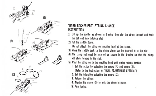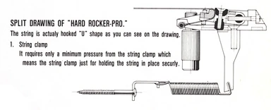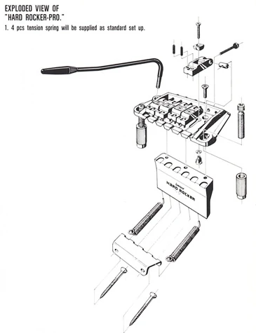 The Hard Rocker Pro bridge consists of a cast metal baseplate below which is screwed a cast metal block. A variable number of springs (typically 2 to 4) are attached to this block and then to a claw mounted in the rear of the guitar. The position of the claw is adjustable to allow the tension of the springs to balance the tension of the strings.