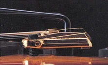 The strings are retained by hooking the ball end in a slot in the leading edge of the bridge and then running the string through the saddle. Each string is clamped down at the saddle with an individual string clamp. These clamps locks the strings into the saddles and contribute to increased tuning stability. These string clamps are the primary difference between this bridge and the Hard Rocker. Both bridges employ a threaded arm.