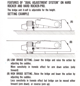 The Hard Rocker Pro is a single locking synchronized tremolo. It is a dual point tremolo which pivots against a pair of studs mounted into the top of the guitar. Rather than employing a more typical knife-edge design, the pivot points are rounded. This design is meant to reduce friction wear and provide smoother rocking action.