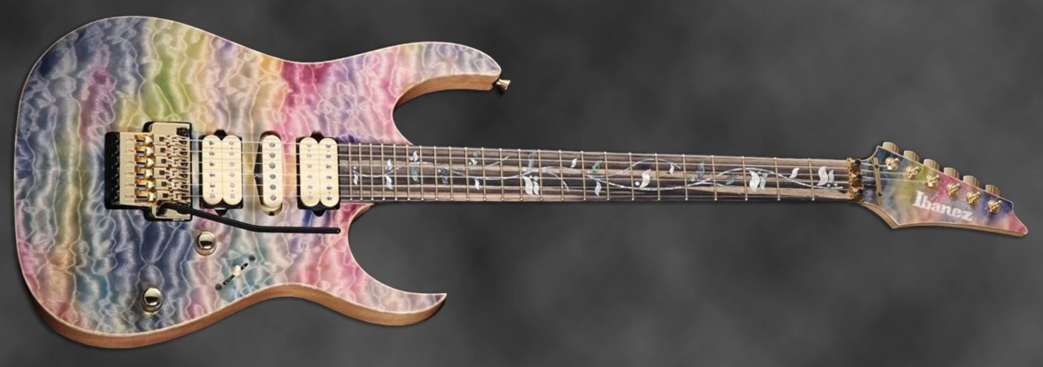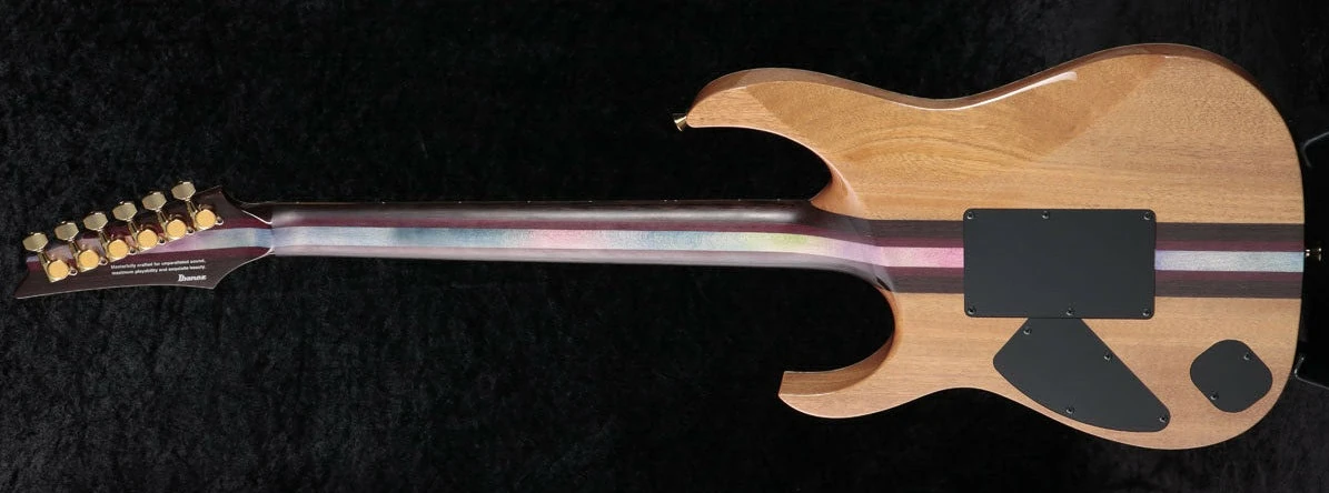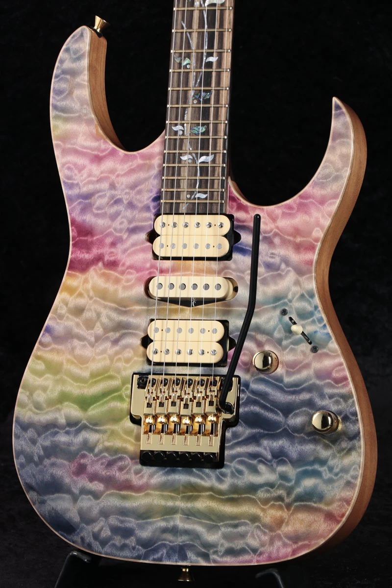 The IJCRG20C02 features neck through body construction with a quilted maple top with maple binding on African mahogany wings mated to a wenge, purpleheart and maple neck with a 24-fret white ebony fretboard with maple binding and pearloid and abalone Tree of Life inlays. The binding continues on the headstock which has the same quilted maple veneer and finish as the top. Components include cream colored DiMarzio pickups with Air Norton and Tone Zone humbuckers flanking a True Velvet single-coil, a Lo-Pro Edge double locking tremolo bridge, recessed Easy Access control knobs, Gotoh tuning machines and Gotoh Free-Lock II strap pins.