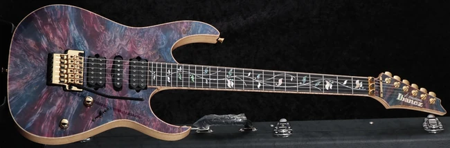 The IJCRG80th4 features neck through body construction with an exotic burl maple top with faux binding on ash body wings mated to a maple and purpleheart asymmetric Super Wizard neck with a Velvetouch finish and an ebony fingerboard with pearl and abalone Tree of Life vine inlays and 24 stainless steel frets. Components include a Lo-Pro Edge double locking tremolo bridge, DiMarzio pickups with a pair of Fusion Edge humbuckers flanking a True Velvet single-coil, recessed Easy Access control knobs, Gotoh locking strap buttons and Gotoh tuning machines.