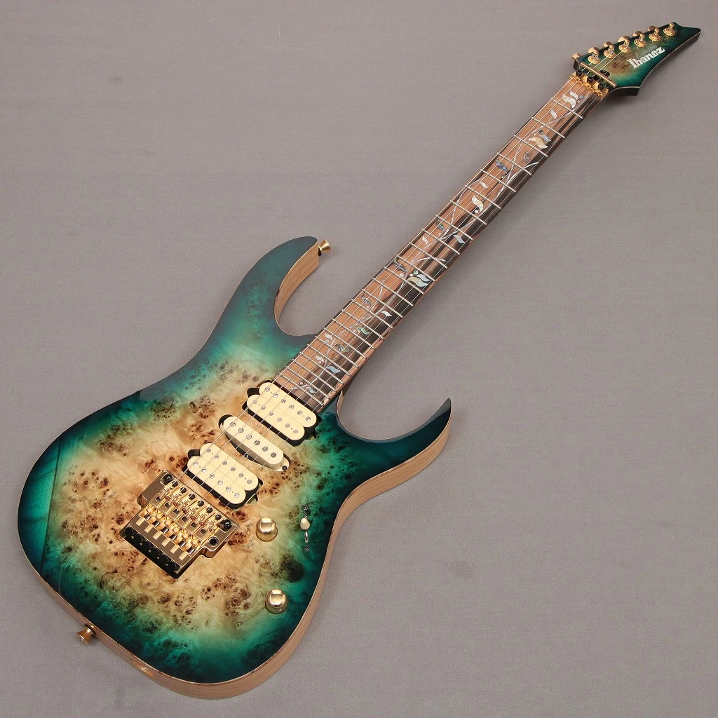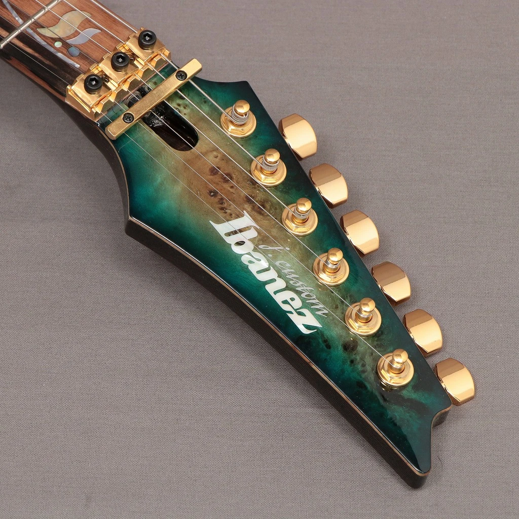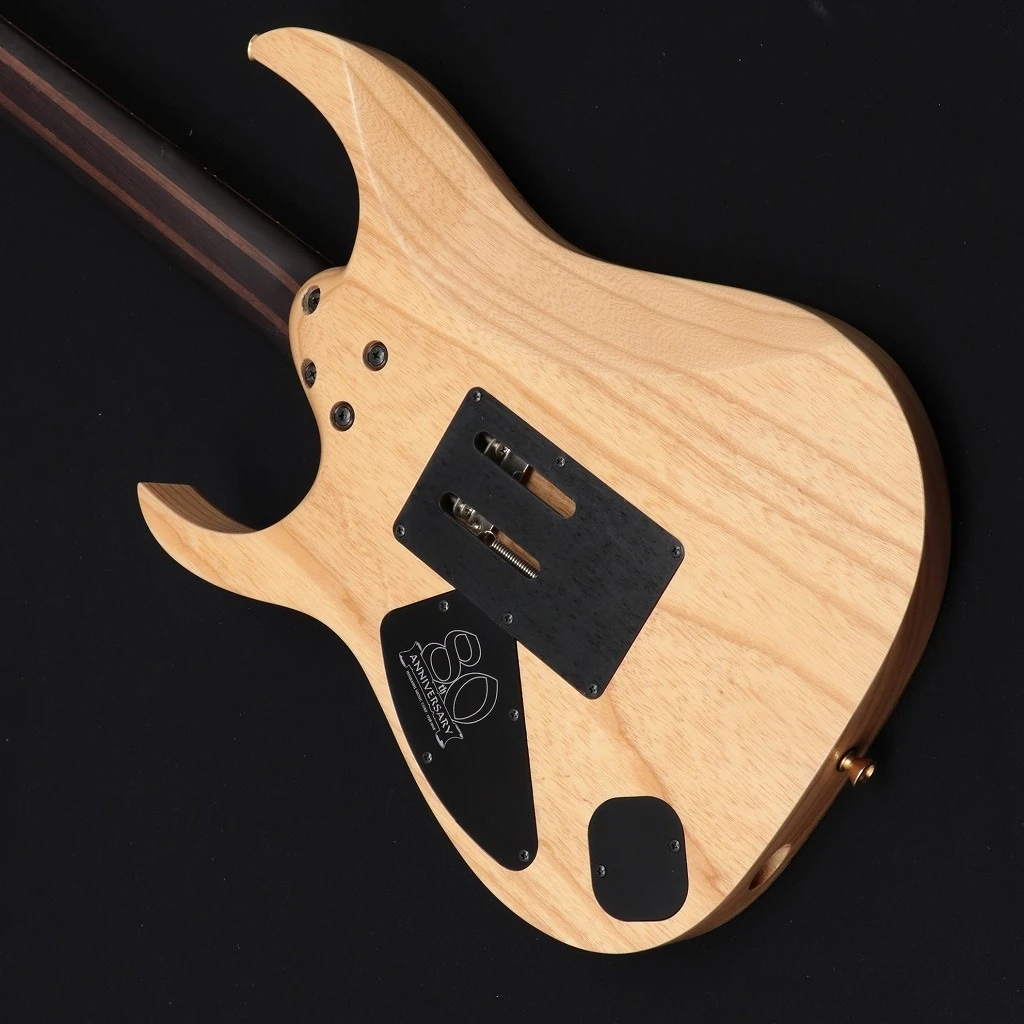 The IJCRG80th5 features a poplar burl top with faux binding on an ash body bolted to a wenge and walnut Super Wizard neck with a Velvetouch finish and a 24-fret selected striped ebony fingerboard with pearl and abalone Tree of Life vine inlays . Components include a Lo-Pro Edge double locking tremolo bridge, DiMarzio pickups with Air Norton and The Tone Zone humbuckers flanking a True Velvet single-coil, recessed Easy Access control knobs, Gotoh locking strap buttons and Gotoh tuning machines.