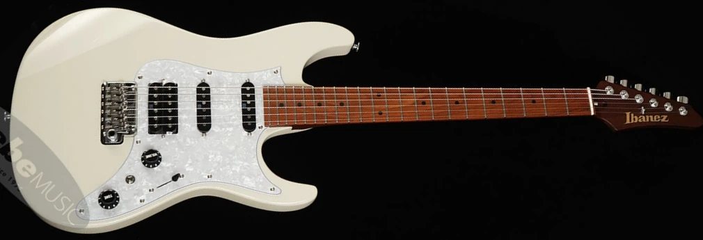 The IKAZ01 features an alder body bolted to an S-Tech roasted maple oval C shaped neck with an S-Tech roasted maple fingerboard with 22 stainless steel frets, black dot position markers and Luminlay side dots. Components include Seymour Duncan Hyperion pickups mounted in a white pearloid pickguard with a humbucker at the bridge and single-coils in the neck and middle positions, a T1802 two-point synchronized tremolo bridge with titanium saddles made by Gotoh, an oil-impregnated bone nut, an angled output jack, and Gotoh locking tuning machines with height-adjustable posts.