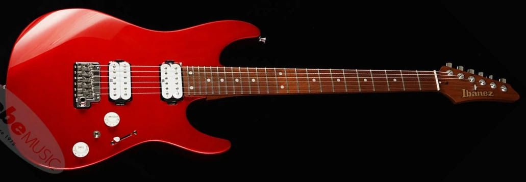The IKAZ04 features an alder body bolted to an S-Tech roasted maple oval C shaped neck with a S-Tech roasted maple fingerboard with 24 stainless steel frets, black dot position markers, and Luminlay side dots. Components include a pair of white Seymour Duncan Hyperion humbucking pickups, a T1802 two-point synchronized tremolo bridge with titanium saddles made by Gotoh, an oil-impregnated bone nut, white top hat knobs, an angled output jack, and Gotoh locking tuning machines with height-adjustable posts.