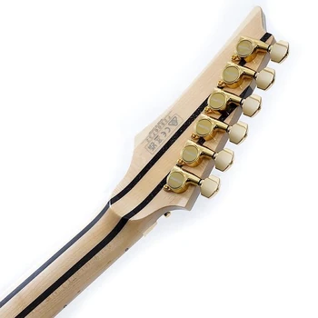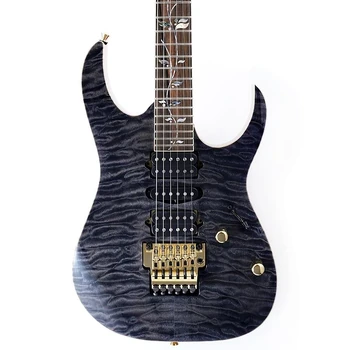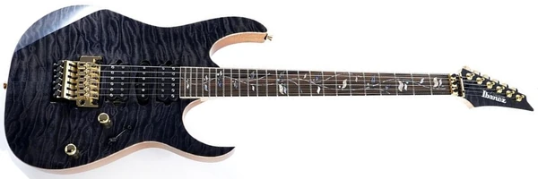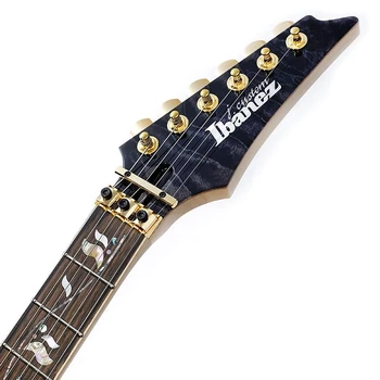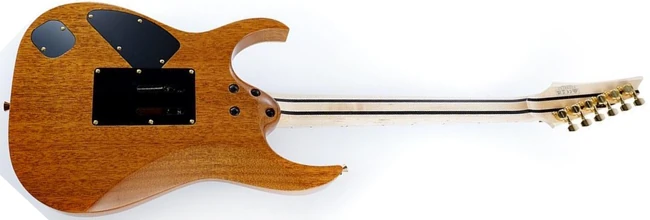 The IKRG85702 features a mahogany body with quilted maple top bolted to a maple and wenge neck with a 24-fret ebony fingerboard with abalone and mother of pearl Tree of Life inlay. The neck is built with a Super Wizard profile. The headstock features quilted maple to match the body. Components include DiMarzio pickups with black Air Norton (neck) and Air Zone (bridge) humbuckers flanking a True Velvet single-coil, an Edge double locking tremolo bridge, a locking nut, Gotoh tuning machines, and Gotoh knurled metal knobs.