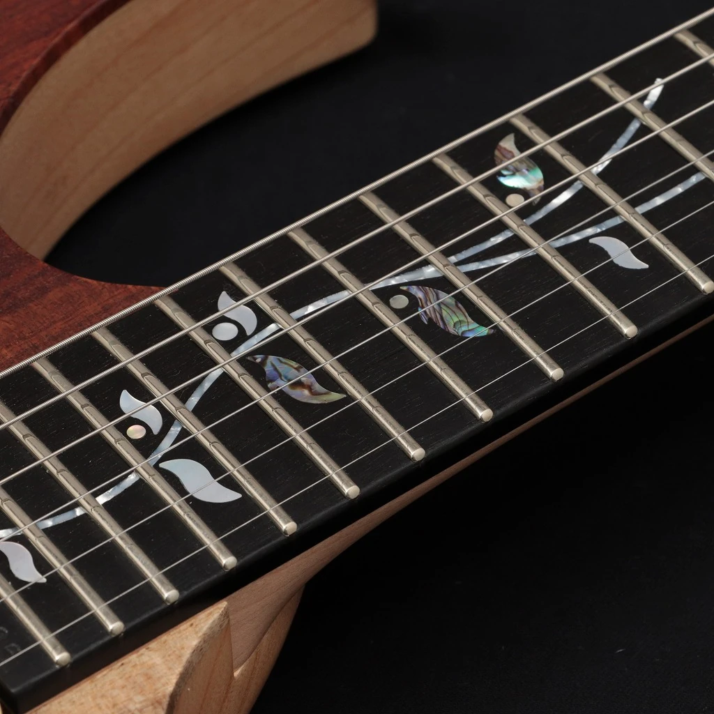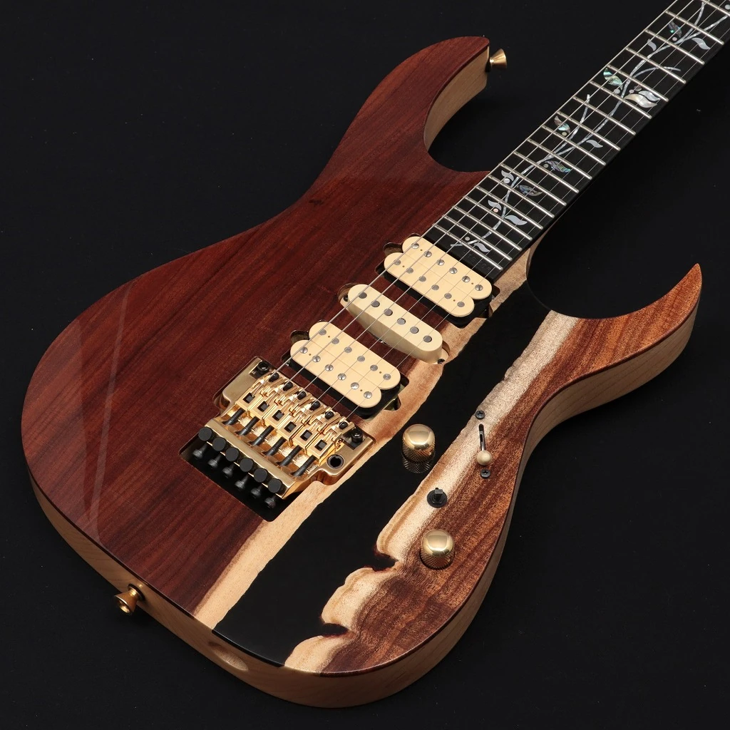 The JCRG1903 features a 4mm thick Hawaiian koa top with a black resin filled strip on a swamp ash body bolted to a maple and purpleheart neck with Velvetouch finish and a selected ebony fingerboard with 24 nickel silver frets with hemispherical fret end treatment and pearloid and abalone Tree of Life vine position markers. The headstock has the same Hawaiian koa veneer. Components include cream colored DiMarzio pickups with Air Norton and The Tone Zone humbuckers flanking a True Velvet single coil, an Edge double locking tremolo bridge, recessed Easy Access control knobs, Gotoh tuning machines and Gotoh Free-Lock II strap pins.