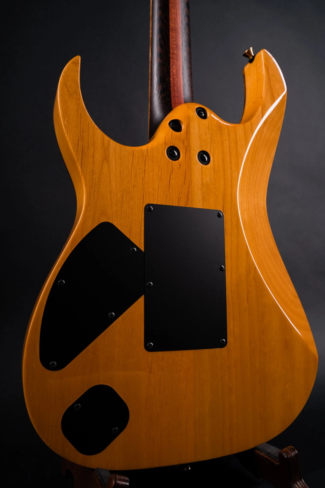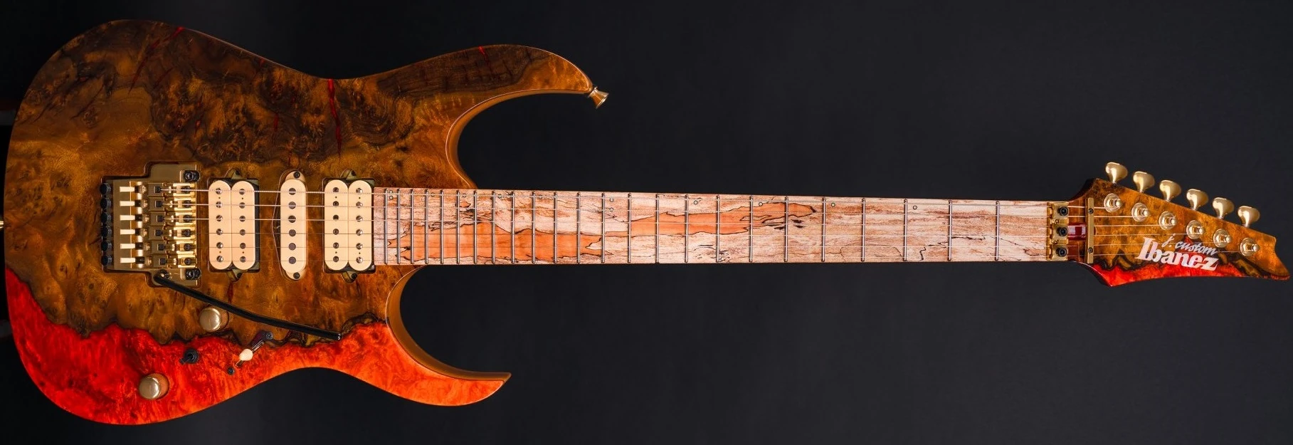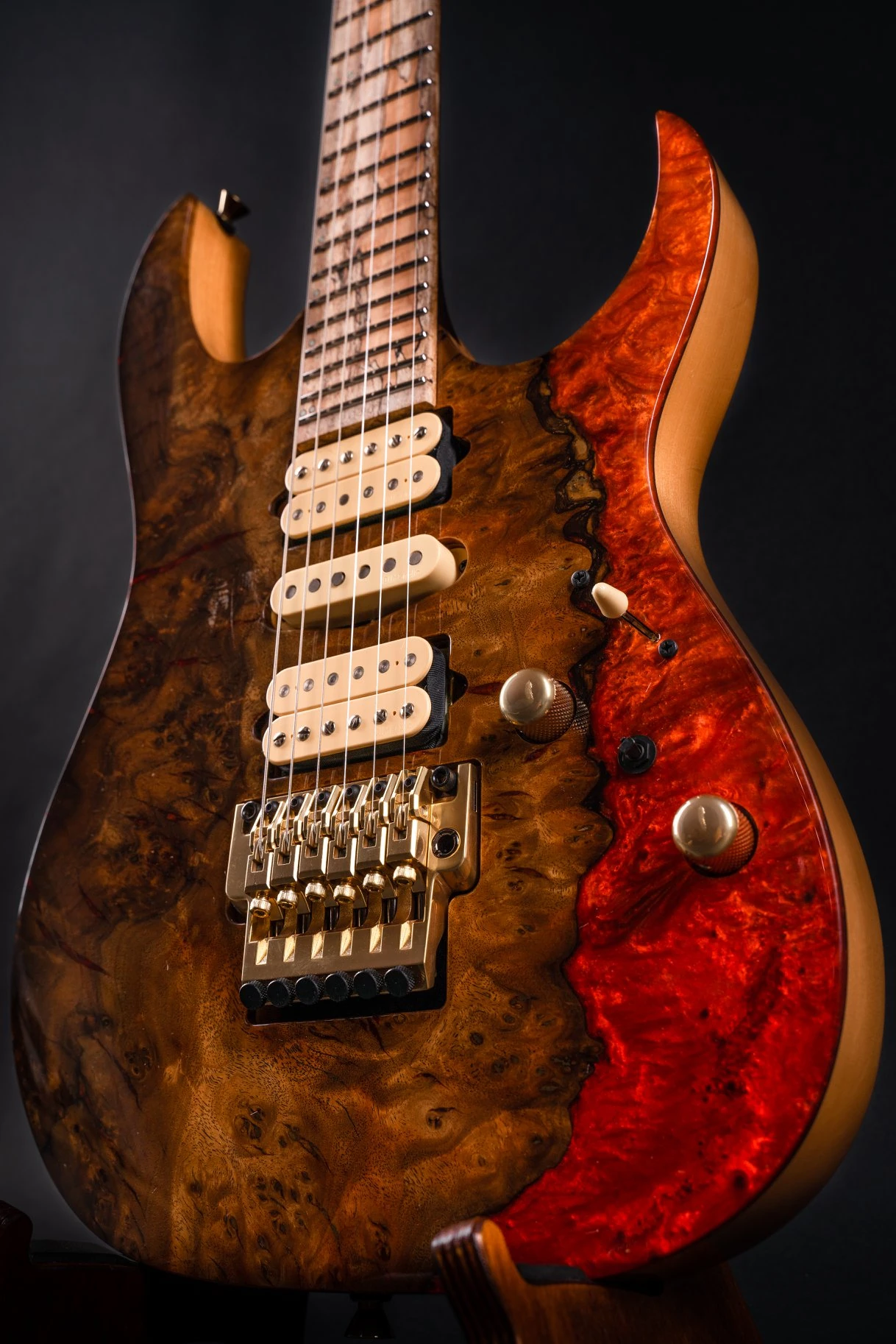 The Ibanez JCRG2006 features a Walnut & Orange Resin top on a super resonant Alder body bolted to a 3pc Wenge/Purpleheart neck with asymmetrical Super Wizard profile, a Spalted Maple fretboard with Jumbo Stainless Steel frets, and a Lo-Pro Edge tremolo. A HSH-configuration of DiMarzio pickups are pumping your riffs into the amp - an Air Norton in the neck position, a True Velvet in the middle, and a Tone Zone at the bridge,it comes with gotoh machine heads,multitool, strap lock pin, and a certificate.