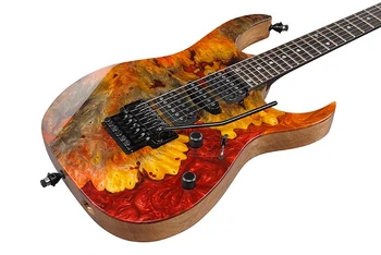 The JCRG2204 features a buckeye burl & red resin top on a black limba body bolted to a wenge and maple neck with an ebony fingerboard with mother of pearl dot position markers, Luminlay side dots and 24 stainless steel frets. Components include a pair of DiMarzio pickups with Air Norton and The Tone Zone humbuckers flanking a True Velvet single-coil, a Lo-Pro Edge double locking tremolo bridge, Gotoh tuning machines and Gotoh locking strap pins.
