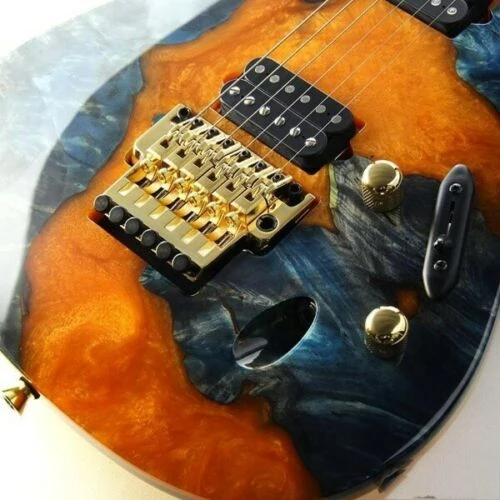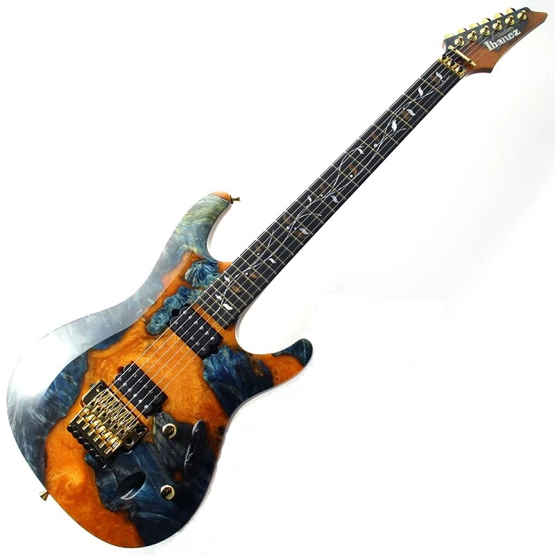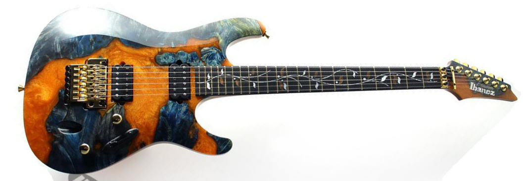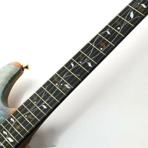 The JCS2101 features a buckeye burl top which has had its voids filled with orange & blue resin on a Honduras mahogany body mated to a set-in Honduras mahogany and purpleheart neck with a 22-fret ebony fingerboard with abalone and mother of pearl Tree of Life inlay. The headstock features a buckeye burl and resin veneer to match the body. Components include a pair of DiMarzio PAF 36th Anniversary humbucking pickups, a Lo-pro Edge double locking tremolo bridge, a locking nut, Gotoh tuning machines, African mahogany rear cavity covers, and Gotoh knurled metal knobs.
