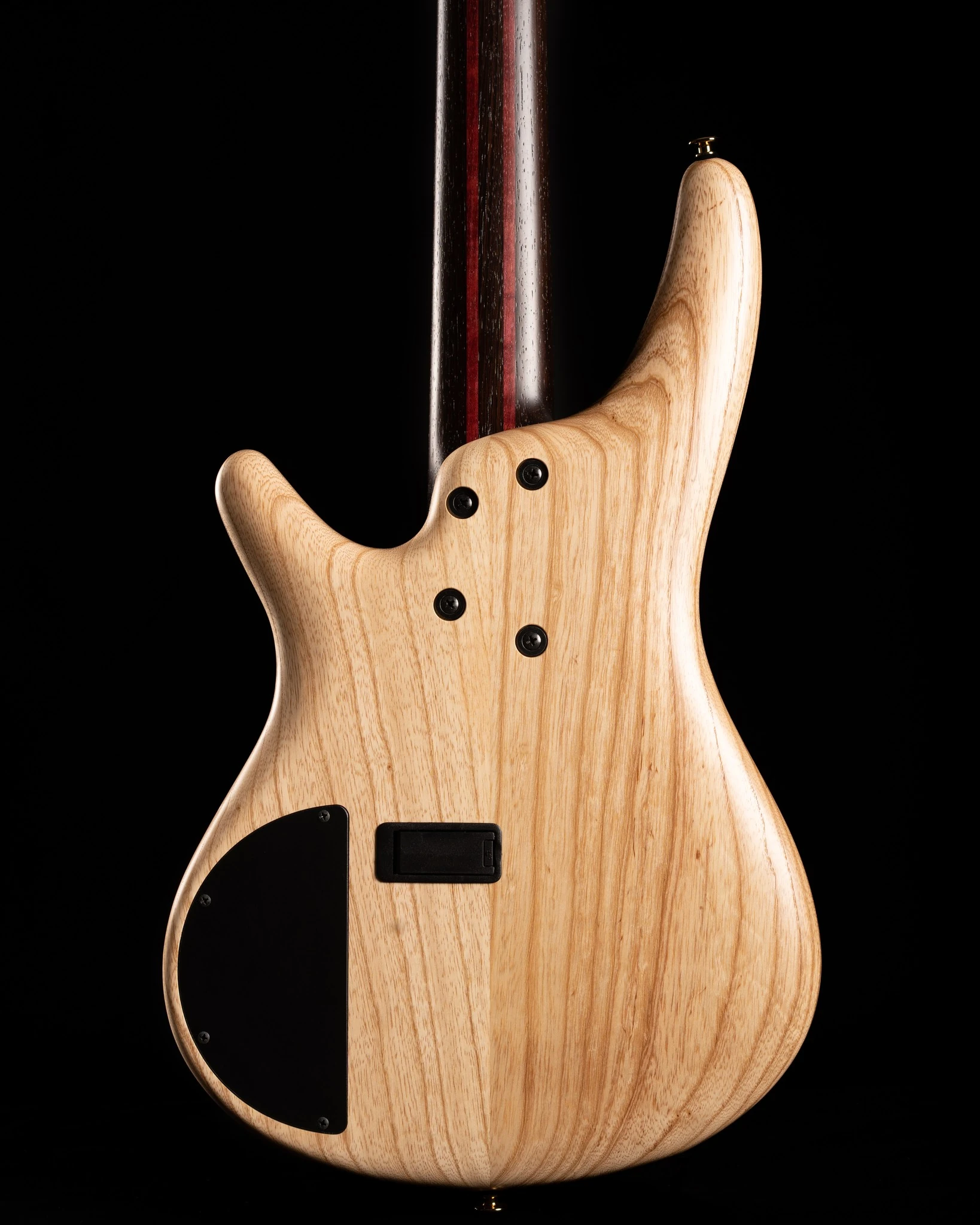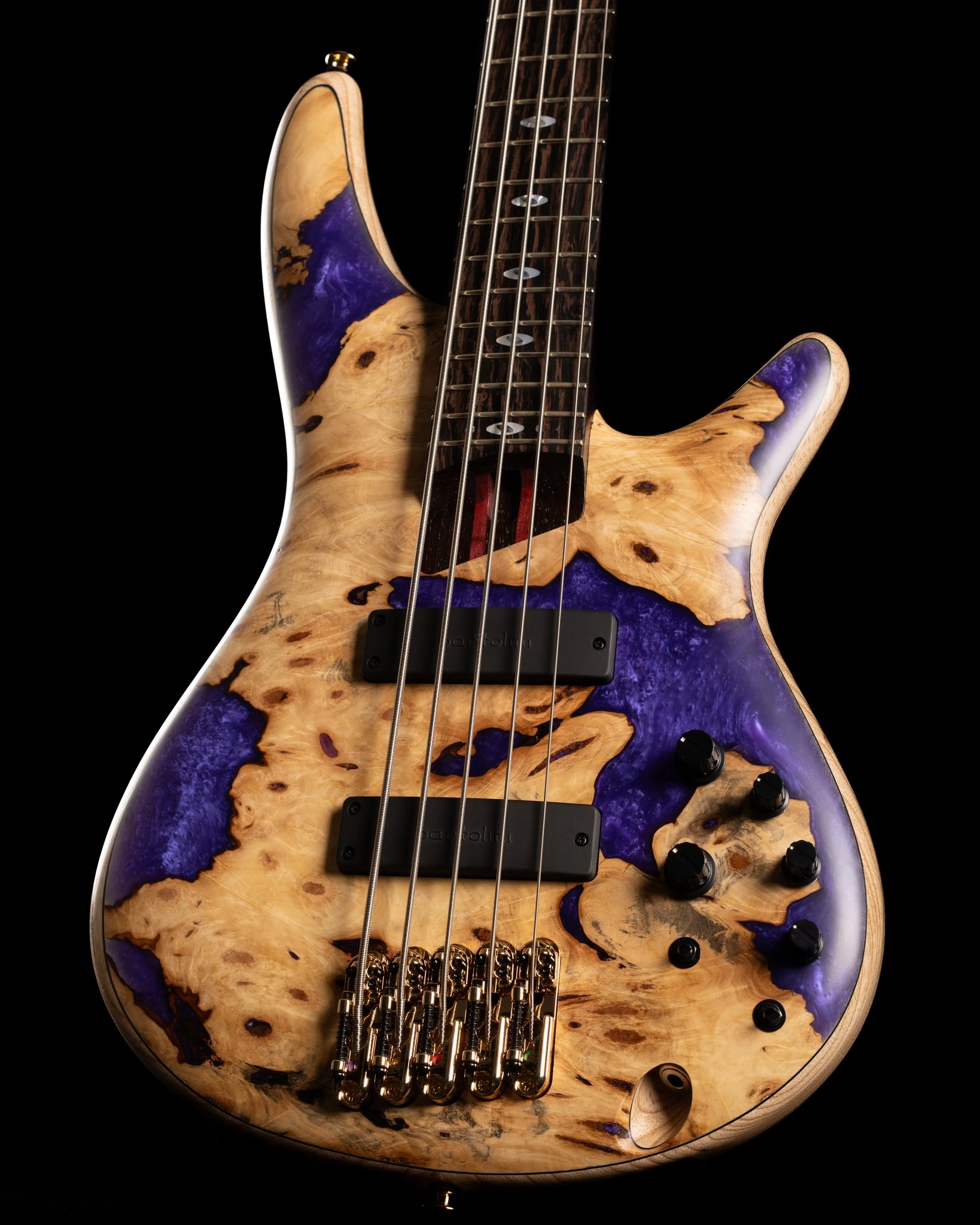 The JCSR2501 features a double-cutaway ash body with chestnut burl top with purple resin bolted to a wenge and purpleheart SR5 neck with a 24-fret ebony fingerboard fingerboard with mother of pearl and abalone oval position markers. Components include a pair of Bartolini Custom 5-string passive pickups with wood covers routed through an Ibanez Custom Electronics preamp with 3-band EQ with adjustable mid-frequency crossover point and a bypass switch, an MR5S bridge with 16.5mm string spacing, a GraphTech Black TUSQ nut, gold hardware and Gotoh tuning machines.