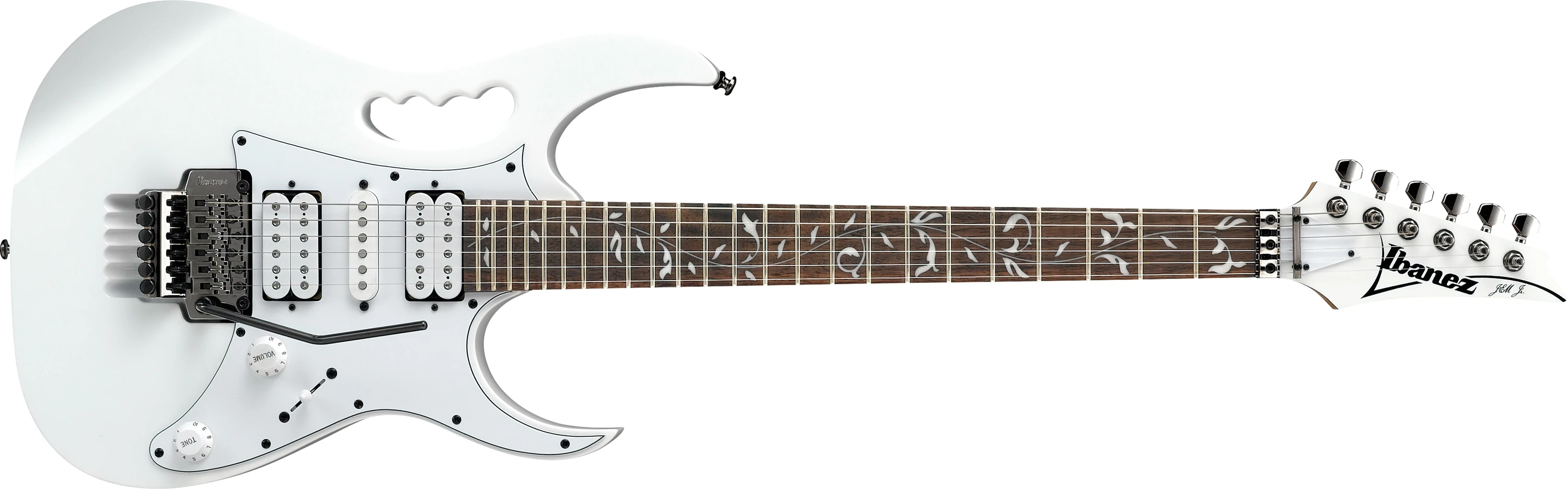 As with all JEM models the body features Vai's signature monkey grip on the upper body and lion's claw rout behind the tremolo. It has an all-white color pattern, with white body, headstock, pickups, pickguard, fingerboard inlay and knobs.