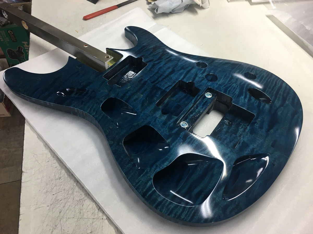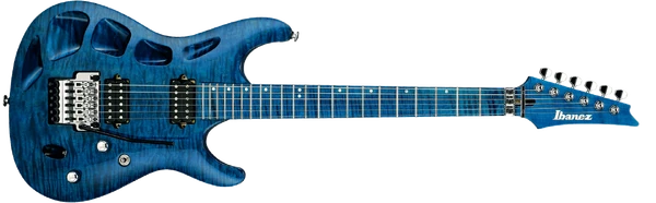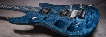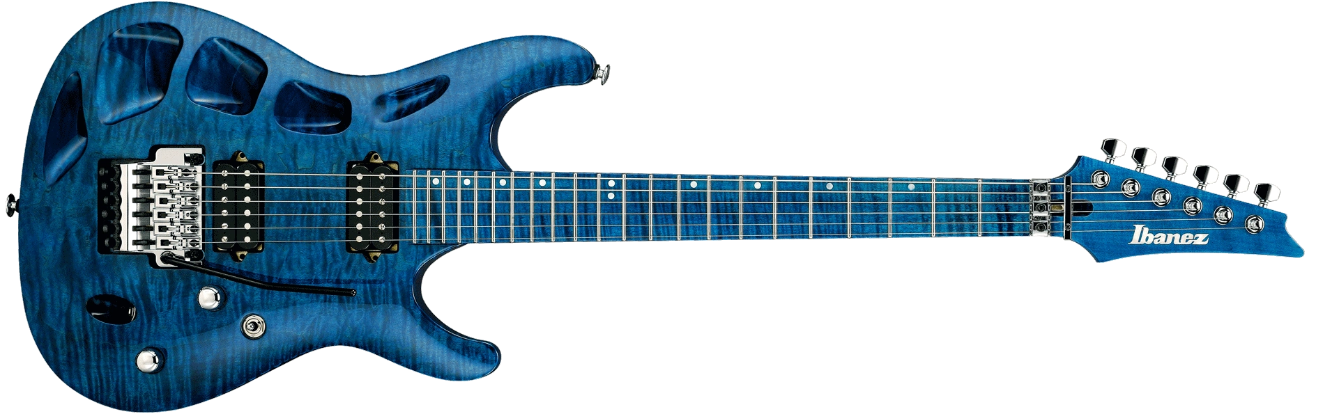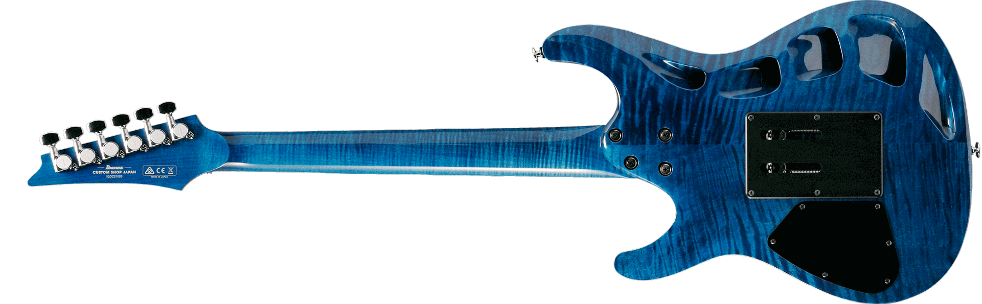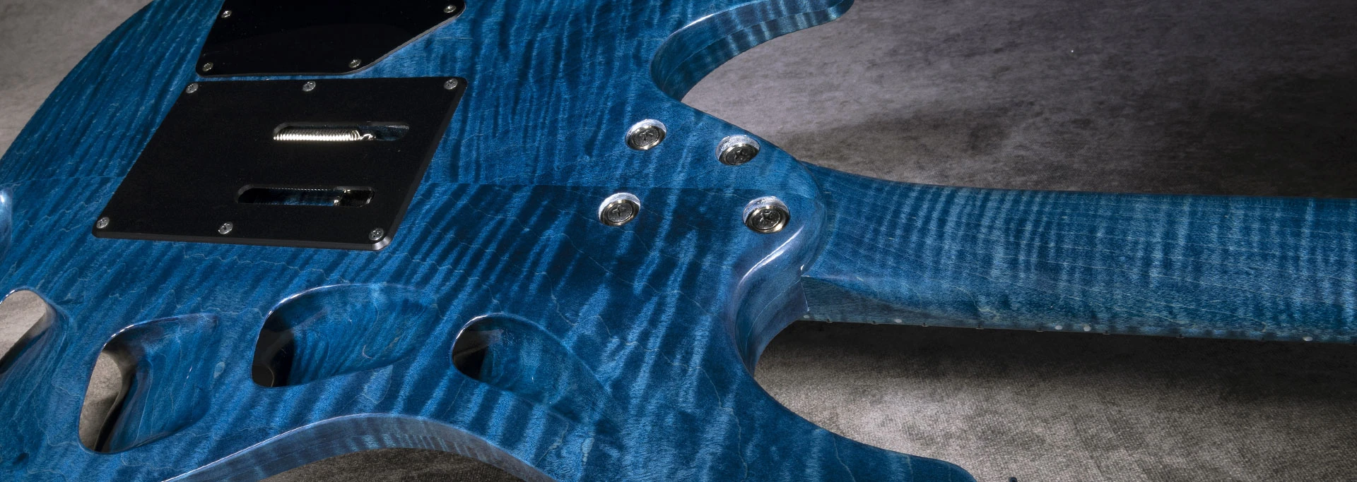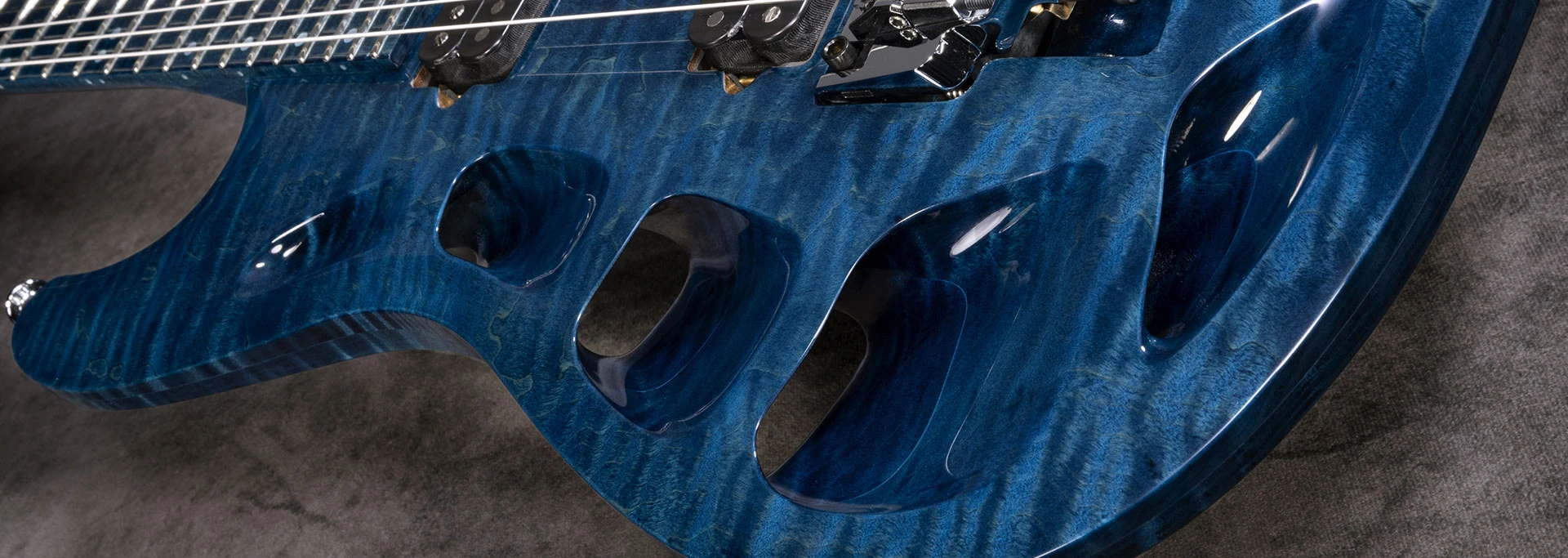 This guitar is highly unique among the 50th Anniversary Collection in that it is built entirely from Flamed Maple. From the body to the neck and fingerboard, the viewer is treated to a panorama of stunning Flamed Maple figuring. A luxurious Transparent Blue finish covers the entirety of the instrument, even the fretboard. It’s a phenomenally stunning instrument and a true one-of-a-kind. Serving as both the functional and aesthetic highlight of this guitar, these weight relief cuts are hand-carved into the body and actually run through it, from the front to the back. They add some enticing visual complexity, while also taking what’s already a light instrument and scaling back its weight even further.