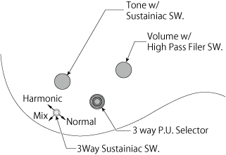 Besides the finish the other defining feature of this model is the Sustainiac driver neck pickup. This is the first Ibanez production model to incorporate this technology. The Sustainiac feature is controlled by a push-pull on/off switch on the tone control as well as a 3-way toggle with three settings: harmonic, normal or mixed. Additionally the volume control has a push-pull switch which activates a high-pass filter.