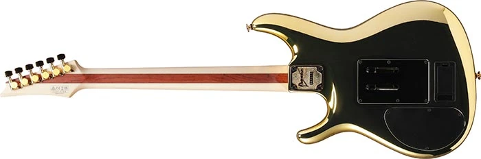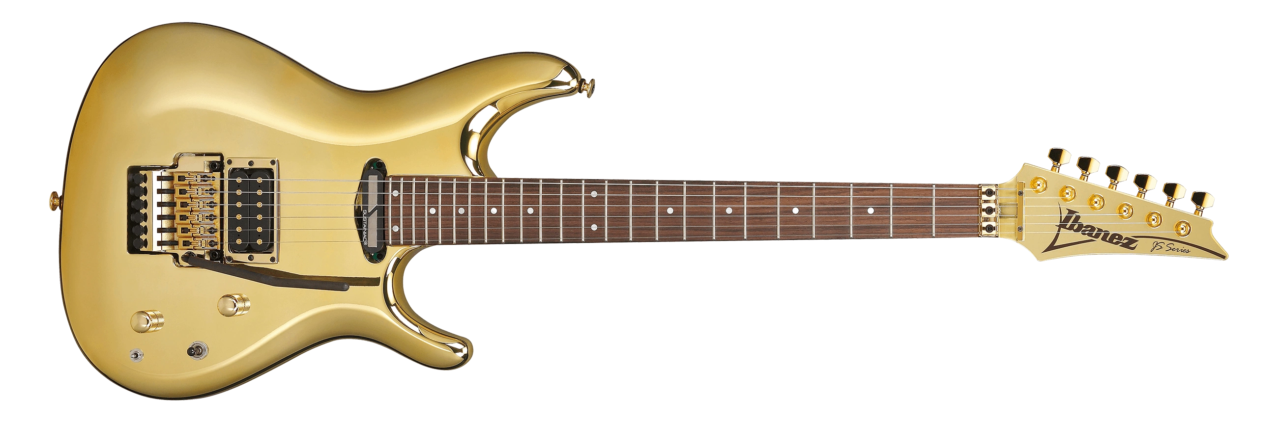 The JS1GD features an alder body with a vibrant gold finish bolted to a maple and bubinga neck with a 24-fret rosewood fingerboard with mother of pearl dot position markers. Pickups are a DiMarzio Satur8 humbucker at the bridge and a single coil Sustainiac driver at the neck; controls consist of a master volume with push/pull hi-pass filter, a master tone with push/pull Sustainiac switch, a Sustainiac voicing toggle, and a 3-way pickup selector. Components include an Edge double locking tremolo bridge with carbon fiber Ultralite arm, a locking nut, and Gotoh machine heads.