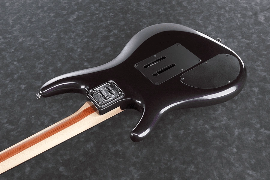 The JS2450 alder body bolted to a maple and bubinga neck with a 24-fret rosewood fingerboard with mother of pearl dot position markers. Components include DiMarzio pickups with color-matched bobbins with a Mo Joe humbucker at the bridge and a Satch Track single-coil sized humbucker at the neck, an original Edge double locking tremolo bridge with a carbon fiber Ultralite tremolo arm and Gotoh tuning machines.