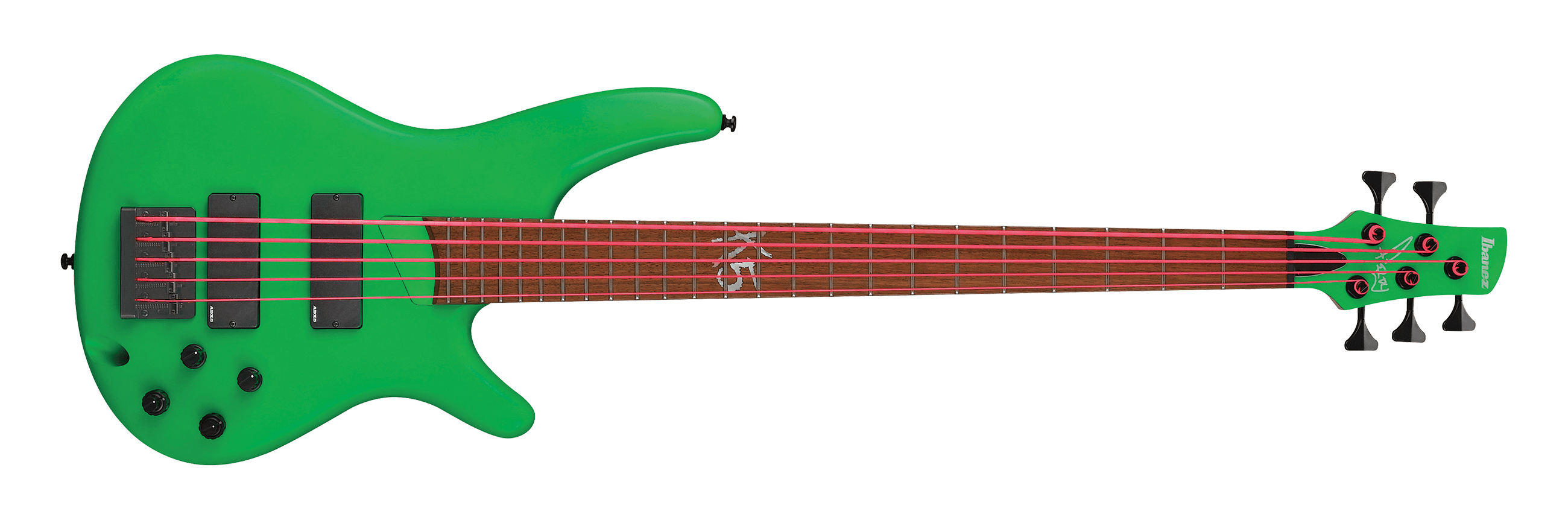 The K5LTD features an SR series double-cutaway nyatoh body bolted to a maple and walnut neck with a 24-fret jatoba fingerboard with a K5 logo at the twelfth fret. Components include a pair of Ibanez ADX-5 active bass pickups with a Vari-Mid III preamp with a three-band EQ, a EB-7 fixed bridge with 16.5mm string spacing, a plastic nut and DR neon pink coated strings.