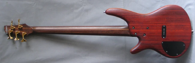 The K5 features padauk top and back on an SR series double-cutaway mahogany body bolted to a wenge and walnut neck with a 24-fret rosewood fingerboard with a K5 logo at the twelfth fret. Components include a pair of Ibanez ADX-5 active bass pickups with a Vari-Mid III preamp with a three-band EQ, a fixed bridge with 16.5mm string spacing and a plastic nut.
