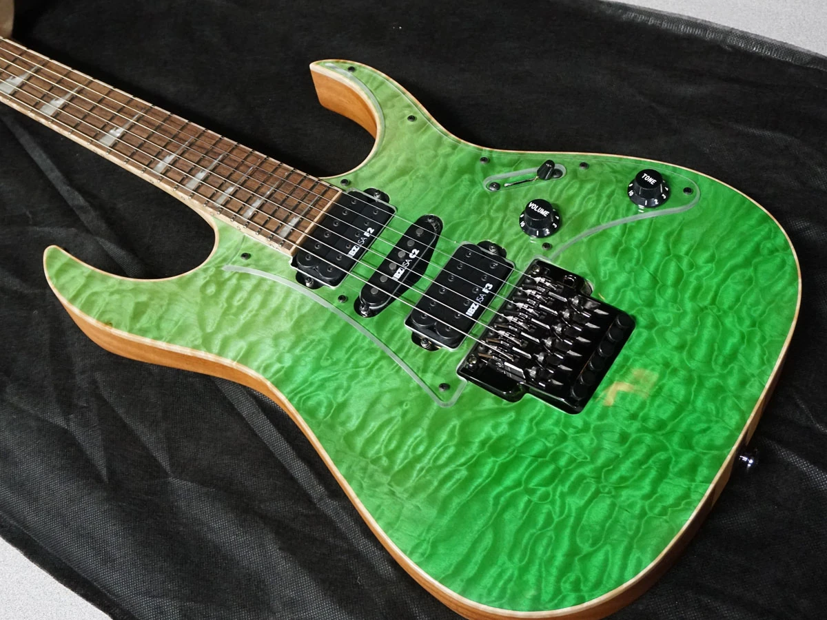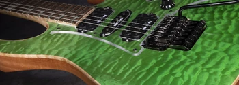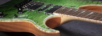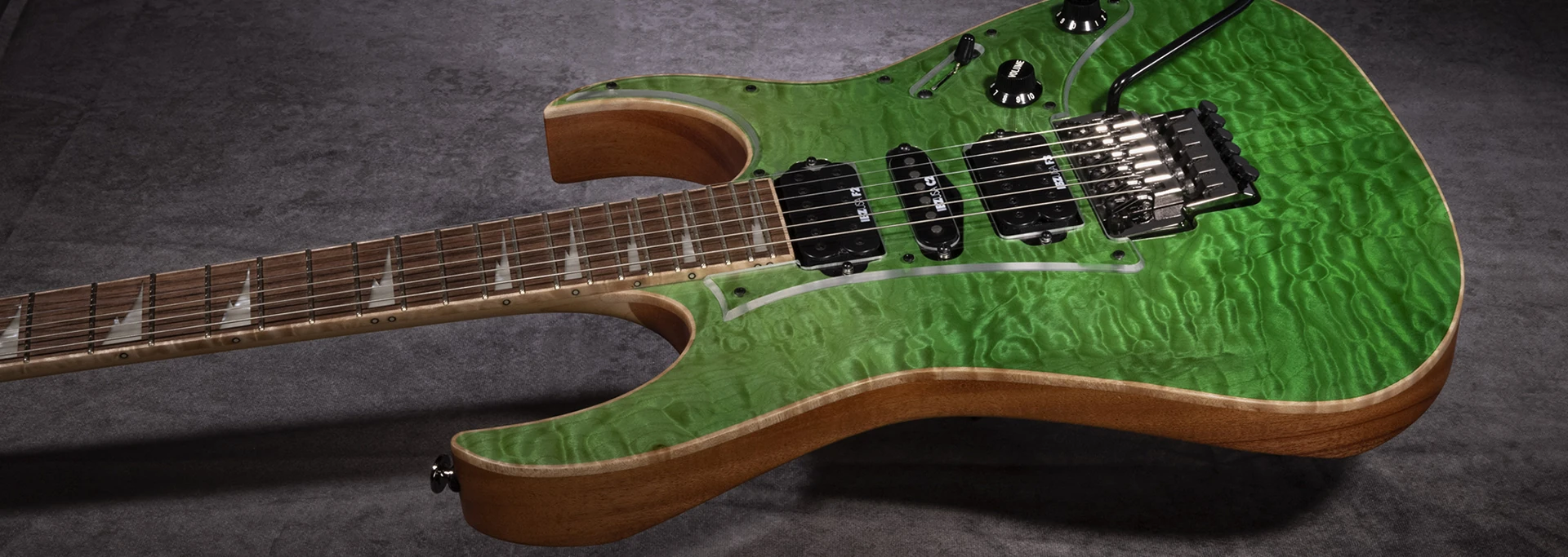 The RG770 was first introduced in 1990 and, for many years, it sat atop the iconic RG series. This iteration of the venerable 770 was conceptualized by the LA Custom Shop as a fusion of different RG770 design traits from various models, as well as a few special features exclusive to this custom shop one-off. One major visual highlight is the heavily Quilted Maple top, a feature borrowed from the RG770QM. The top is also stained in a rich green from which the “Sweet Peat,” moniker is derived. Direct mounted pickups, a popular highlight of the RG770 standard models, are also featured. The team opted for a clear pickguard in order to incorporate a signature element from the RG770DX reissue models from 2008. The neck-thru design, Quilted Maple fretboard binding, headstock volute and natural matte finished back and sides are all additional custom features exclusive to this guitar.