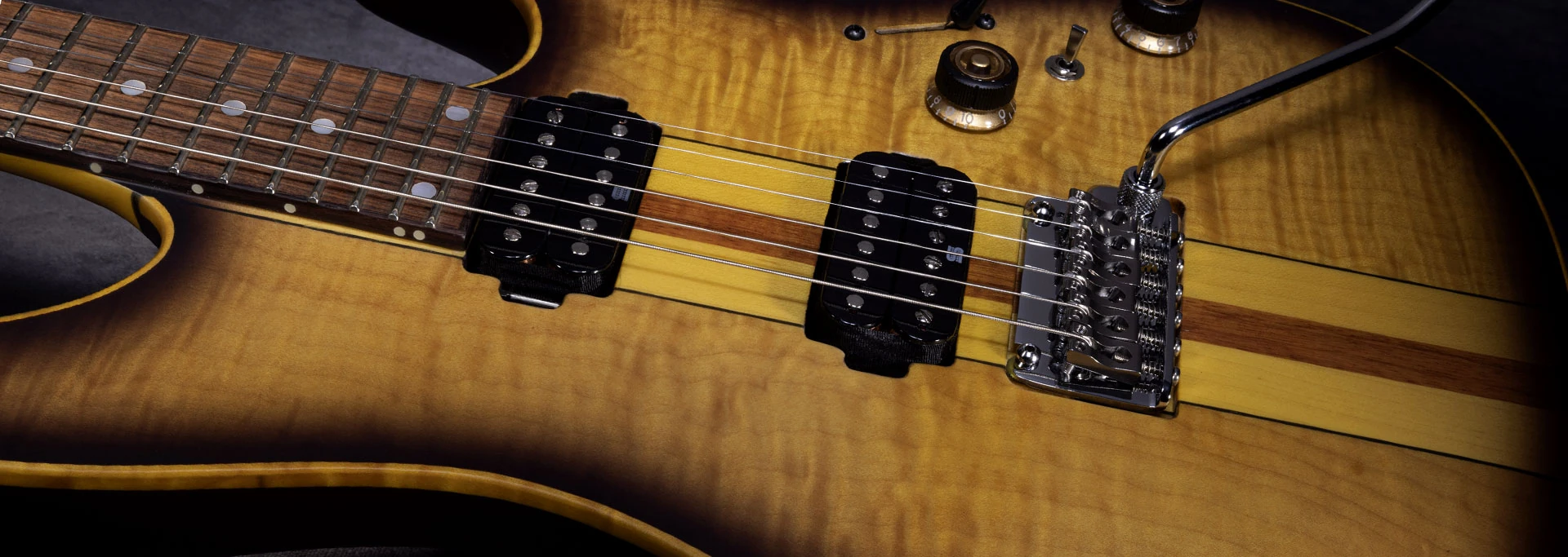 The LACS3 - "GOLDEN EAGLE" features neck-through-body construction with Swamp Ash body attached to a 3 piece maple and purpleheart neck with a 24-fret pau ferro fingerboard with mother of pearl dots position markers and luminescent side dots, a black headstock with a golden Ibanez logo. Components include a pair Seymour Duncan Hyperion™ Humbucking pickups in the neck and bridge positions, a Gotoh T1802 two-point synchronized tremolo bridge. Chrome hardware and Gotoh Locking tuning machines. Includes Hardshell Case & Certificate of Authenticity.