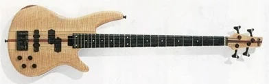 The MAB4FM features neck-through-body construction on mahogany with flamed maple top attached to a maple and purplehearth neck with a 24-fret rosewood fingerboard with pearl dot position markers. Components include an Accu-cast B-IV fixed bridge with 19mm string spacing, and a pair of EMG (P/J) pickup's channeled through an active preamp EQ, a plastic nut and gotoh tuning machines.