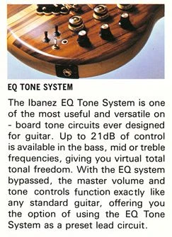 The MC550 has active electronics consisting of a master volume and tone control, a gain (EQ boost/ cut) control, a 3-band EQ (bass, mid and treble), a Tri-sound switch to allow each pickup to be coil split or reverse phase, and an EQ on/off toggle with an LED indicator. Ibanez refers to this configuration as the EQ Tone System.