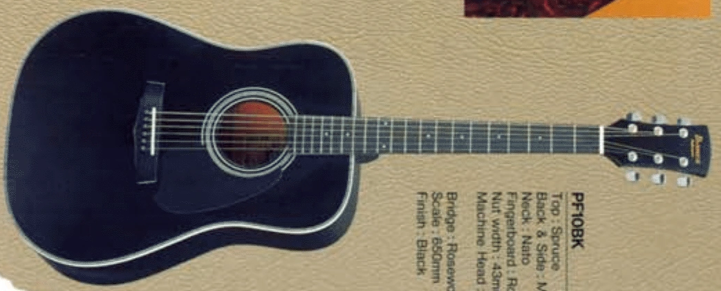 The PF10L is a left-handed version. The PF10-12 is a similar 12-string model. The PF10E and PF10CE are related electric-acoustic models.