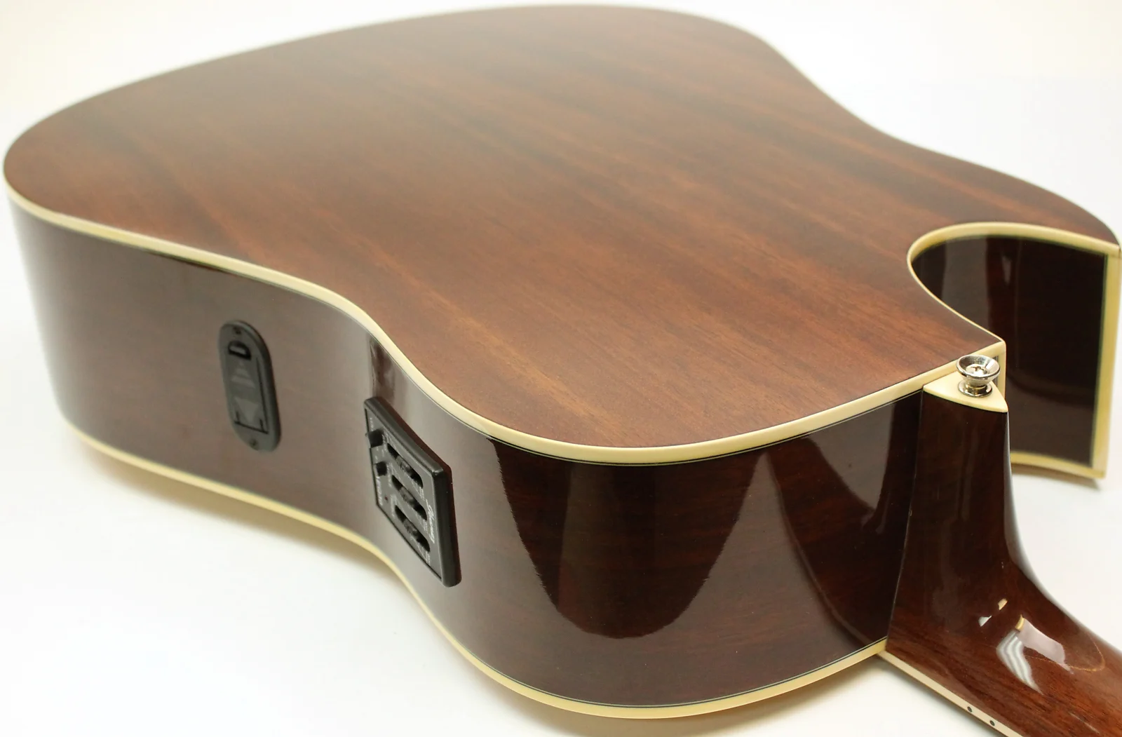 The PC300CE features a dreadnought body with a hard Florentine cutaway constructed of a laminated spruce top on laminated mahogany sides and back. It has a high gloss finish. The round soundhole has a wood mosaic rosette. The mahogany neck has a 20-fret rosewood fingerboard with pearl dot position markers. Components include a compensated plastic saddle in a rosewood bridge with white bridge pins, a plastic nut, and chrome die-cast tuning machines.