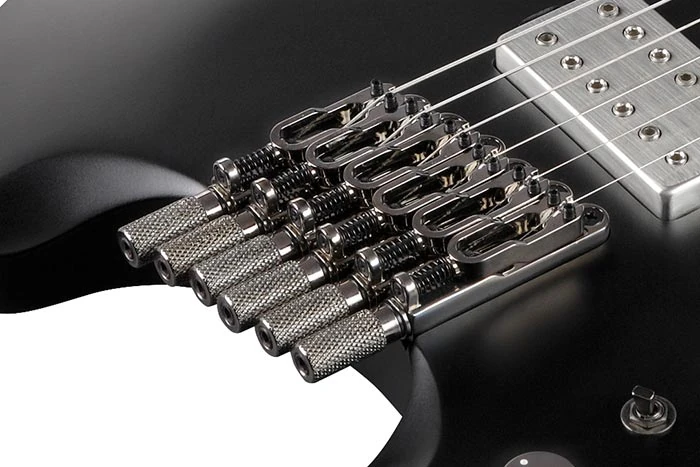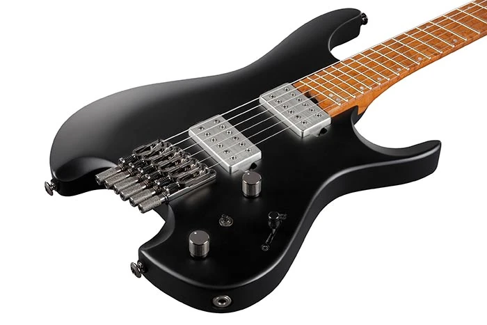 The QX52 features an ergonomic, compact, light-weight and resonant nyatoh body bolted to a roasted maple and bubinga neck with a 24-fret roasted birdseye maple fingerboard with mother of pearl step off-set dot position markers and luminescent side dots. Components include a pair of Q58 humbucking pickups, individually mounted Mono-Tune bridges with integrated tuning mechanisms, a plastic nut, and a custom string lock.