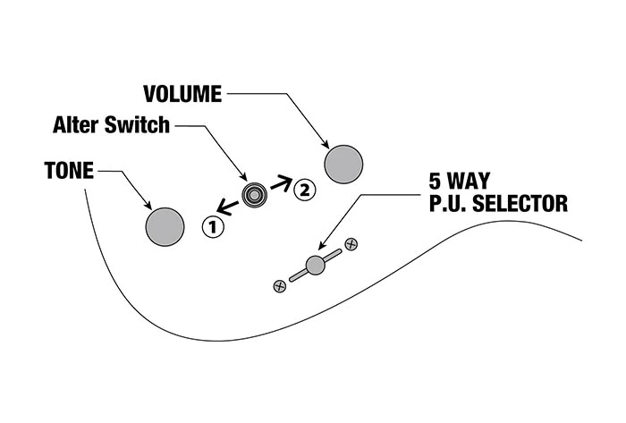 The Q52 employs a dyna-MIX10 switching system (see diagram below) with an "Alter switch" toggle which allows the user to access ten distinct tones. The Alter switch appears to tap one coil of the humbucker (as opposed to a traditional coil-split which disables one coil completely) to achieve a sound similar to a single coil without the drop in output which typically accompanies a coil split. The video below offers a sample of some of the tones available.