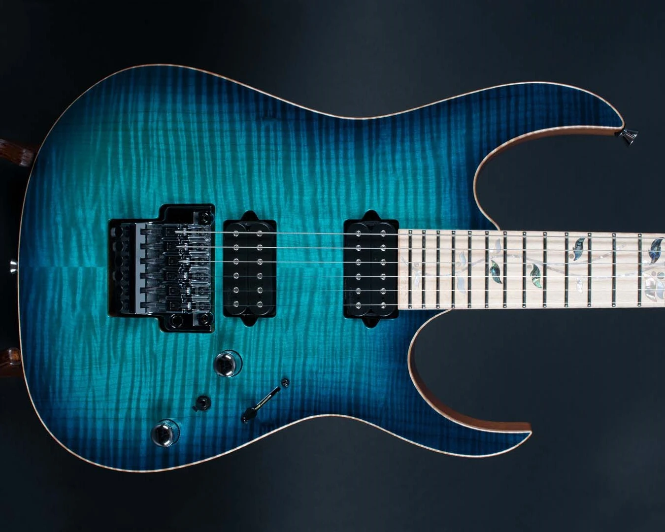 The R4122C13H7-20B features a flamed maple top an African mahogany body bolted to a maple and purpleheart neck with an asymmetric profile and a 24-fret maple fingerboard with pearl and abalone Tree of Life inlays and Luminlay side dots. Components include a pair of DiMarzio Fusion Edge humbucking pickups, an Edge double locking tremolo bridge, Gotoh machine heads and Gotoh Strap lock pins.