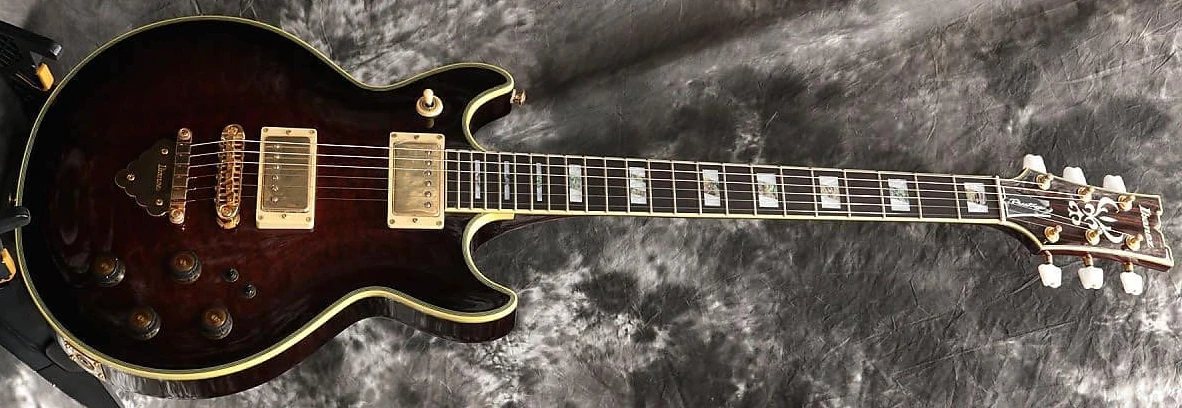 The RAR1 features a sandwich body construction with a sapele burl top, a mahogany back and a hard maple layer between. This body is mated to a set-in maple neck with a 22-fret rosewood fingerboard with binding and pearl and abalone block position markers. Components include a pair of Ibanez Super 58 humbucking pickups with gold cover mounted in ivory plastic pickup rings and with individual volume and tone controls and a pair of Tri-sound switches, a Gibraltar II fixed bridge with a Quik Change tailpiece with cloud ornament, a bone nut, and Gotoh tuning machines.