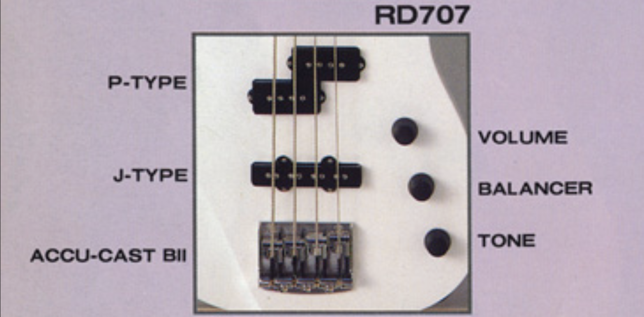 The RD707F is fret-less version. The RD606 and RD808LE are similar models with different pickup configurations. The RD727 is basically the same model with Sharktooth inlays. The RB707E is a predecessor to RD707 with slightly different and more rounded body shape.