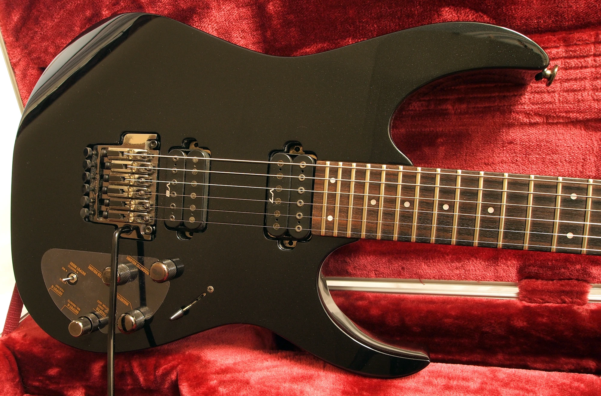 The RG1820X features a basswood body bolted to a maple and walnut neck with a 24-fret rosewood fingerboard with binding and small pearloid dot position markers. Components include a pair of Ibanez humbucking pickups and a Double Edge Pro double locking tremolo bridge with a L.R. Baggs active piezo pickup saddles which offer an acoustic-like tone. Controls consist of a volume, tone and 5-way selector for the magnetic pickups plus a separate volume and 2-band EQ for the piezo along with a 3-way toggle for selecting magnetic pickup only, piezo only or mixed output.