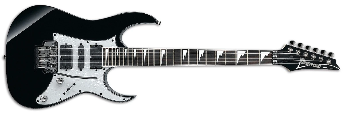 The RG450DXBL is a left-handed version. Similar models are the RG450DXB (black hardware and a white finish), the RG470DXB (no pickguard and black hardware) and the RG450M (maple fretboard).