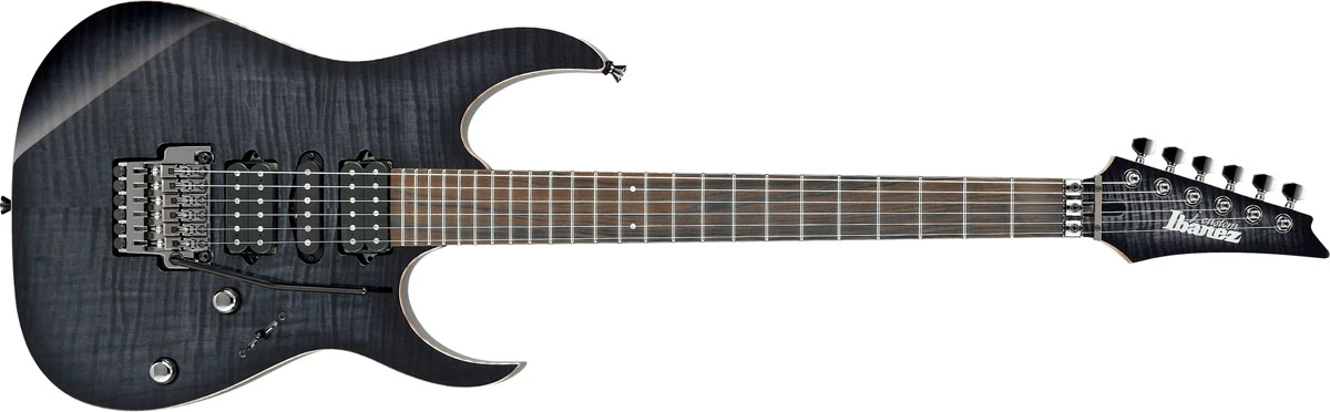 The RG7570 features a AAA flamed maple top with natural binding on an American basswood body bolted to a maple and wenge neck with ultra-thin Super Wizard profile and Velvetouch treatment and a 24-fret Macassar ebony fingerboard with abalone dot position markers only at the twelfth fret. Components include DiMarzio pickups with a pair of Fusion Edge humbuckers flanking a Black Velvet single-coil, a Lo-Pro Edge double locking tremolo bridge, a locking nut, an angled output jack and Gotoh tuning machines and strap locks.