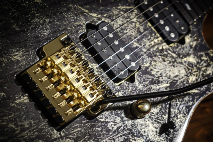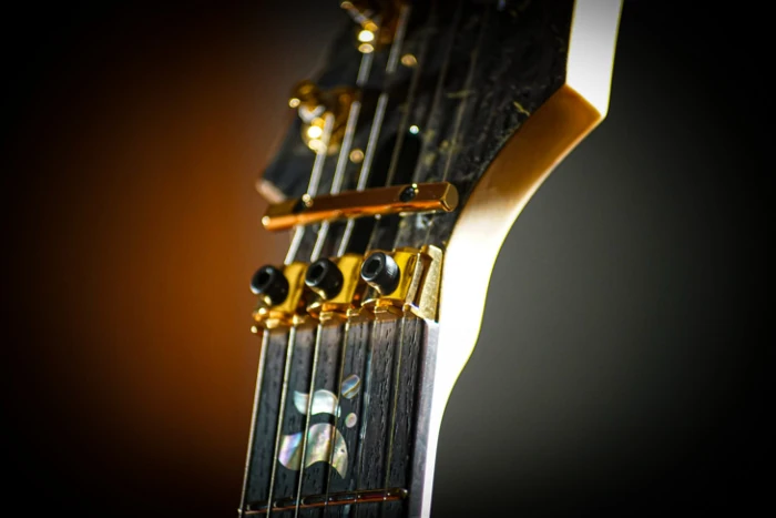 The RG8020G features a one-piece ash body bolted to a maple and wenge neck with a 24-fret rosewood fingerboard with pearl and abalone Tree of Life inlays and Luminlay side dots. Components include a pair of DiMarzio humbucking pickups with an Air Norton in the neck position and a The Tone Zone at the bridge, a Lo-Pro Edge double locking tremolo bridge, gold hardware, Gotoh SG381 machine heads and Gotoh Strap lock pins.
