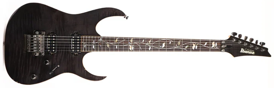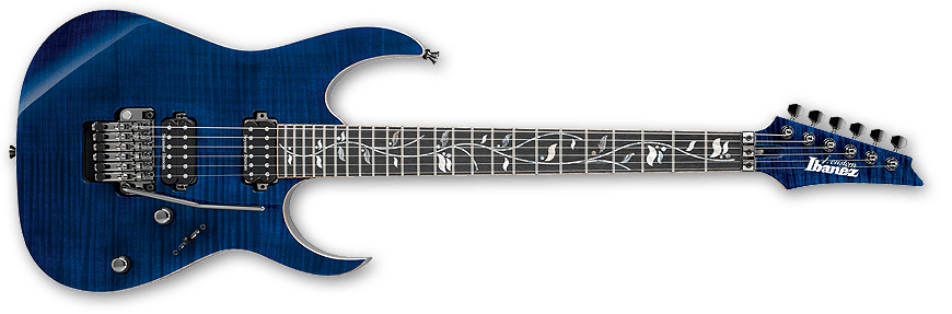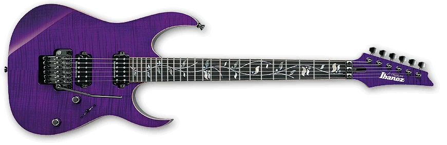 The RG8420ZD features a AAA flamed maple top with binding on an African mahogany body bolted to a titanium reinforced maple and walnut neck with Velvetouch treatment and a 24-fret selected rosewood fingerboard with flamed maple binding Tree of Life vine inlays. Components include recessed Easy Access control knobs, two Seymour Duncan humbucking pickups, an Edge Zero double locking tremolo bridge with a locking nut and a removable ZPS tuning stabilizer and Gotoh tuning machines and strap locks.
