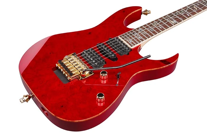 The RG8570ZKR features a 4mm thick Japanese karin wood top on an African mahogany body bolted to a maple and wenge neck with a Macassar ebony fingerboard with 24 stainless steel frets, Tree of Life inlays, and Luminlay side dots. Components include a set of DiMarzio pickups with a with Air Norton and The Tone Zone humbuckers flanking a True Velvet single-coil, an Edge Zero double locking tremolo bridge with removable ZPS3 tuning stabilizer, and gold hardware with Gotoh tuning machines and locking strap pins.