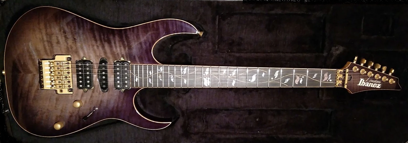 The RG9570 is a very similar model with cosmo white hardware and offset dot position markers rather than the Tree of Life inlay. The RG8670 is another similar model without the neck-through construction and with violet chrome hardware.