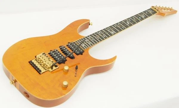 The RG9670 features neck-through construction with Honduran mahogany body wings with a flame maple top attached to a maple and bubinga neck with a 24-fret ebony fingerboard with flame maple binding and Tree of Life vine inlays. Components include DiMarzio pickups with a pair of humbuckers flanking a single-coil, an Edge Pro double locking tremolo bridge with a locking nut and Gotoh tuning machines.