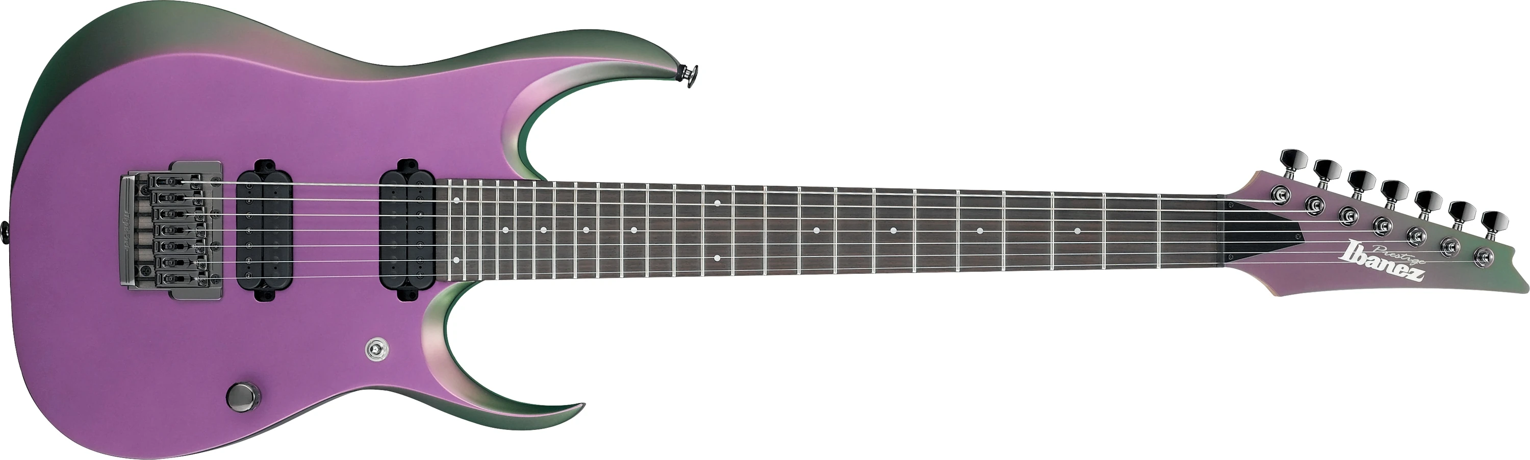 The RGD2127FX features a basswood body bolted to a titanium reinforced maple and wenge neck with a 24-fret rosewood fingerboard with small white dot position markers. Components include Ibanez V77 Custom and V87 Custom humbucking pickups, a Tight-End R-7 fixed bridge, a Graph Tech TUSQ nut and Gotoh tuning machines.