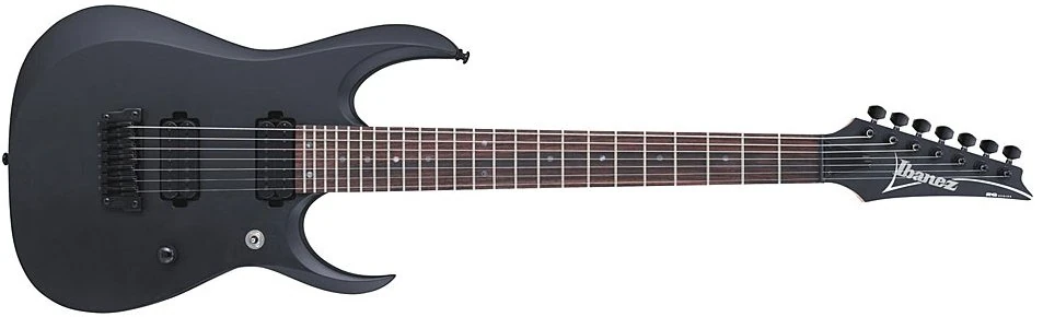 The RGD7421 features basswood body bolted to a 26½" scale maple and walnut Wizard II-7 neck with a 24-fret rosewood fingerboard with black pearl dot position markers. Components include a Gibraltar Standard hard-tail bridge and a pair of Ibanez CAP-VK humbucking pickups. Controls consist of just a master volume and a 3-way toggle pickup selector. Factory tuning is one full step down A-Standard (ADGCFAD).