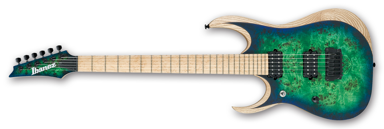 The RGDIX6MPBL features a poplar burl top on a layered ash body bolted to a Nitro Wizard maple and bubinga neck with a 24-fret birdseye maple fingerboard with no inlays. Components include a Gibraltar Standard II fixed bridge, dual DiMarzio Fusion Edge humbucking pickups and Gotoh locking tuning machines.
