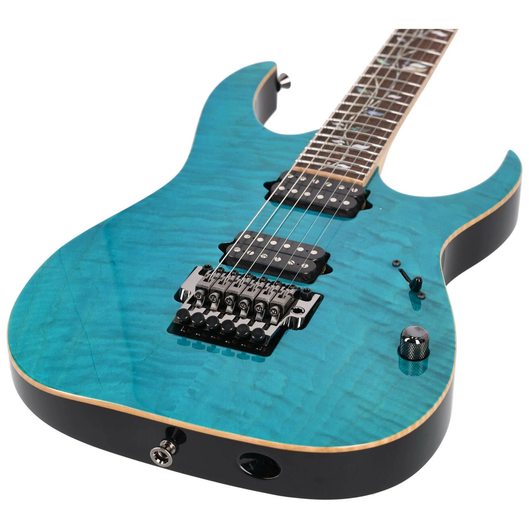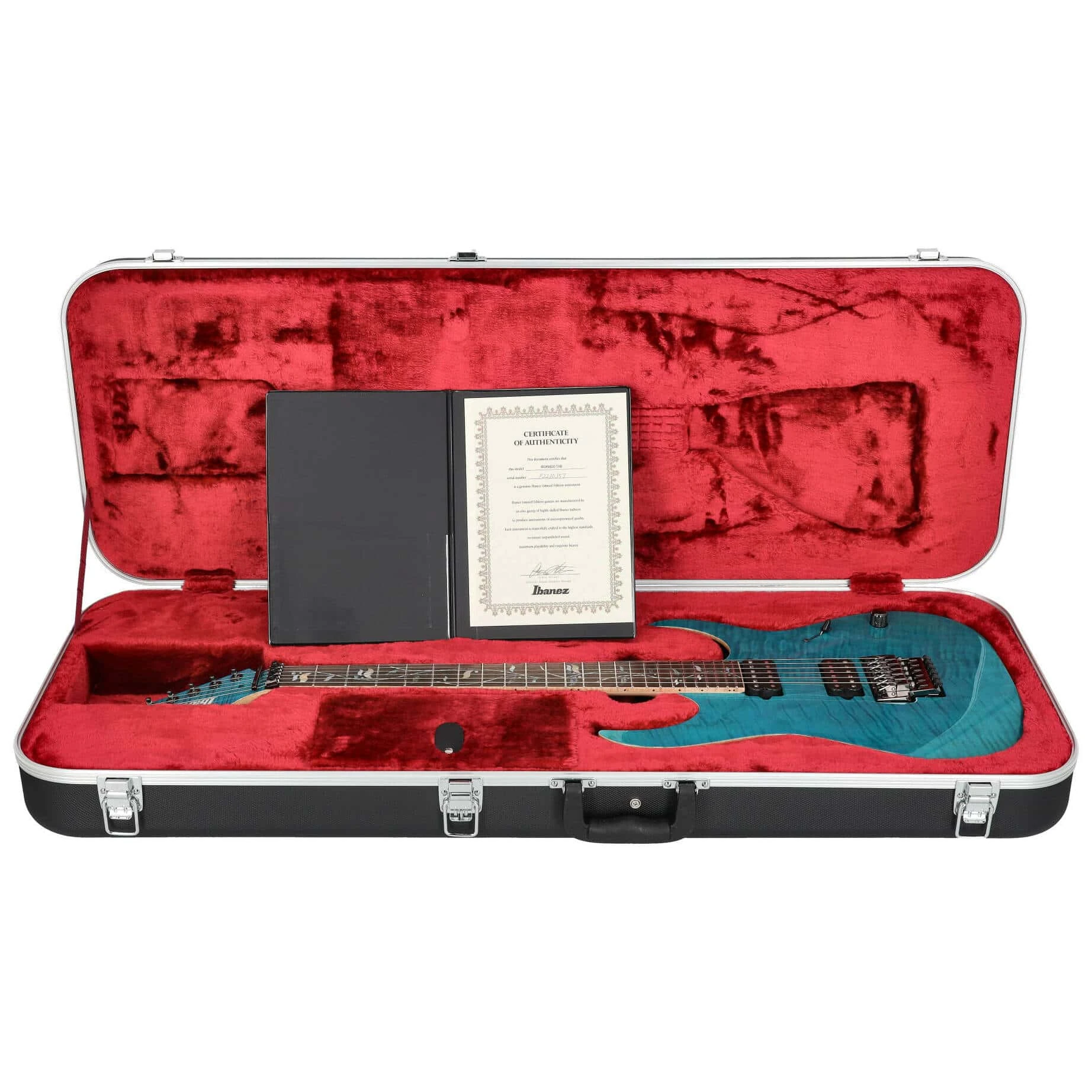 The RGR8620 features basswood body with AAA flamed maple top bolted to a maple and wenge asymmetric super wizard neck with a 24-fret bound macassar ebony fingerboard with abalone & mother of pearl tree of life inlays and luminlay side dots and a reverse headstock. Components include a set of DiMarzio's pickups, a Lo-Pro Edge tremolo, Gotoh SG381 machine heads, Gotoh Strap lock pins and cosmo black hardware and includes a hardshell case and certificate of authenticity.