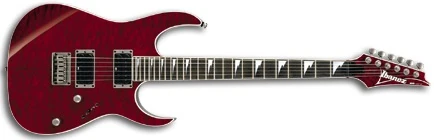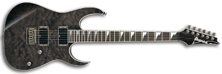 The RGT42FX features a neck-through-body construction with American basswood body wings with a quilted maple top and top binding attached to a maple and walnut neck with a 24-fret bound rosewood fingerboard with sharktooth position markers. Components include dual Ibanez Infinity humbucking pickups and a hard-tail bridge.