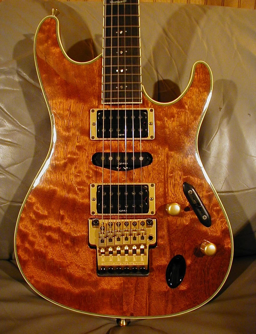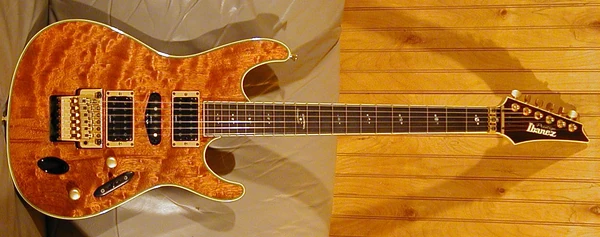 The S2540 is similar in appearance to the S5400J Custom model, but is different in terms of specifications. It features include a mahogany body with a quilted sapele top bolted to a maple Wizard neck with a 22-fret bound rosewood fingerboard with a special "hurricane" position markers. Components include Ibanez Quantum pickups in an HSH configuration, a low profile double locking tremolo bridge and a locking nut.
